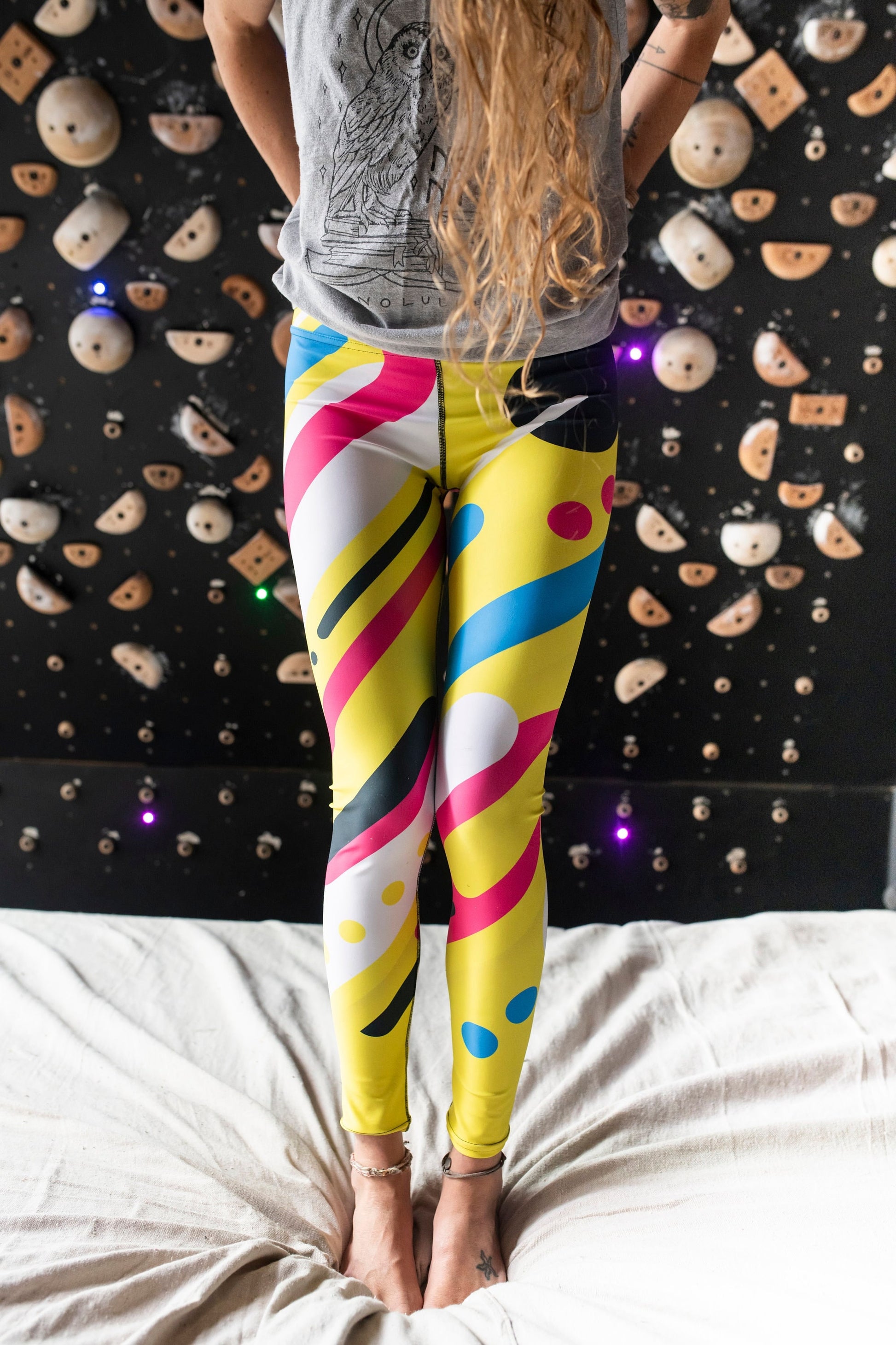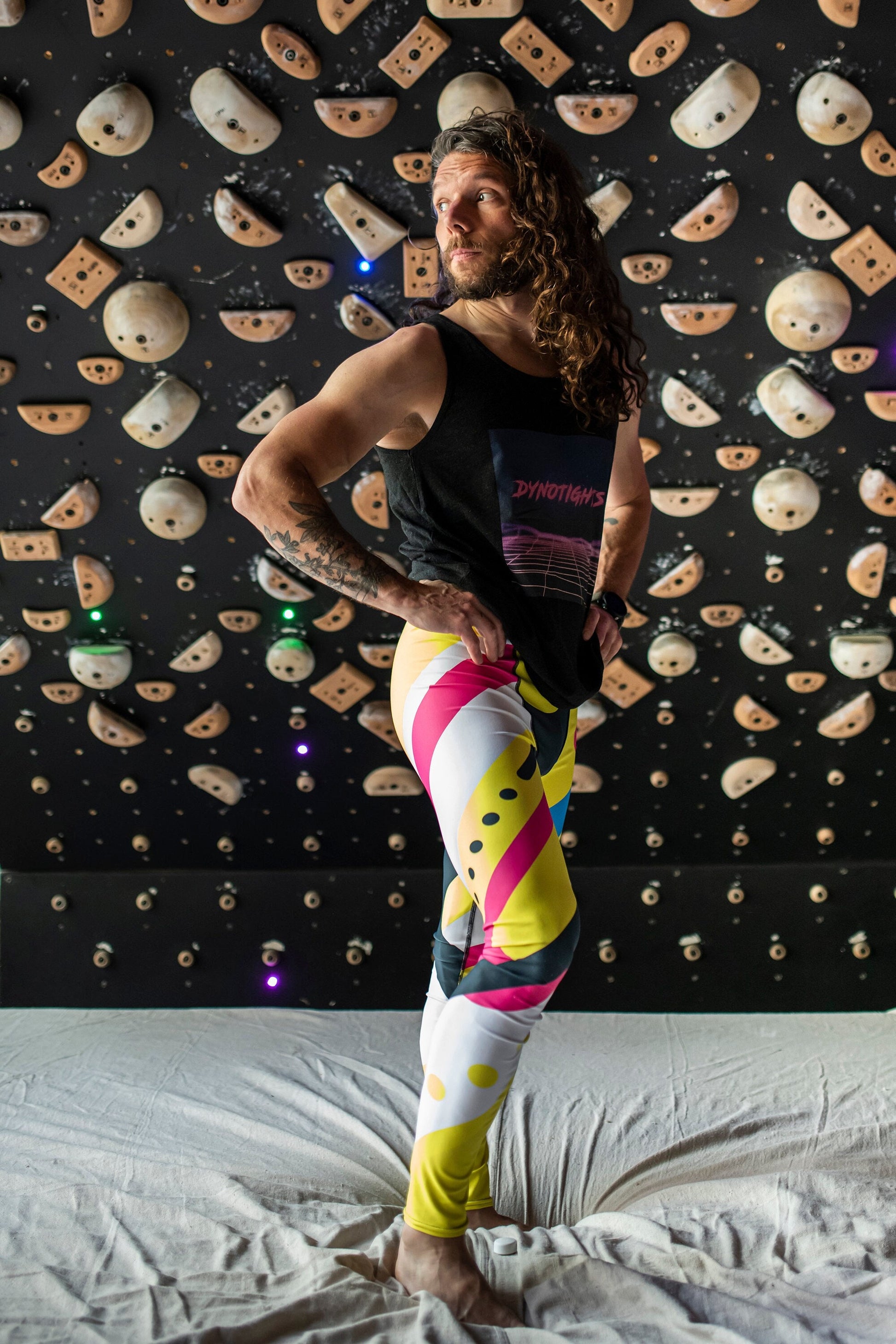 Inspired by a loyal Dynotights Fam on Instagram! Suitable for both men and women and great for climbing, yoga, running, and light layering, these leggings have a bright yellow background with stripes of pink, blue, black and white. Leggings are made of an 82% polyester 18% spandex blend and feature a stretchy elastic waistband. For our stateside customers, they're sewn by hand here in the USA!