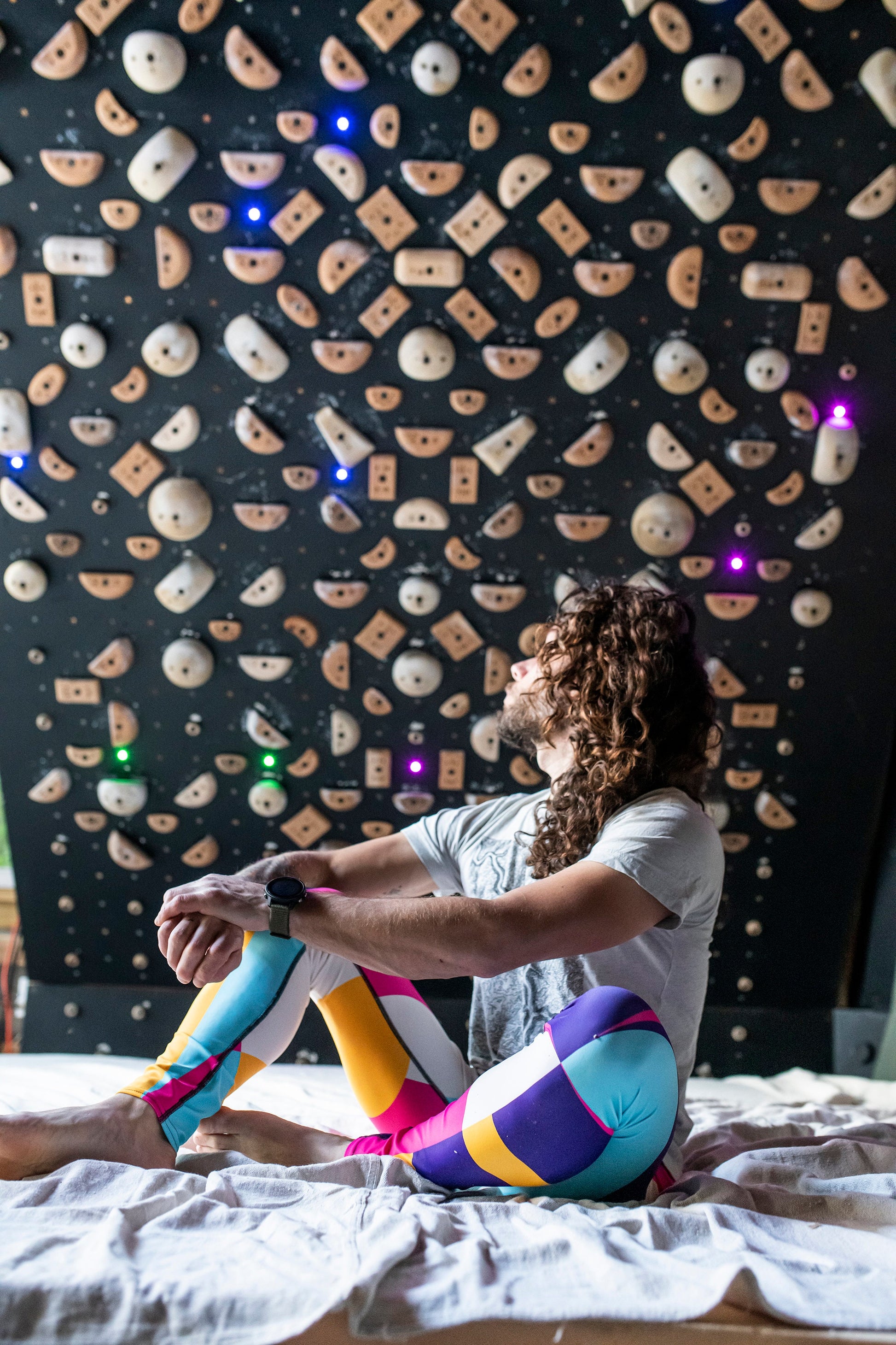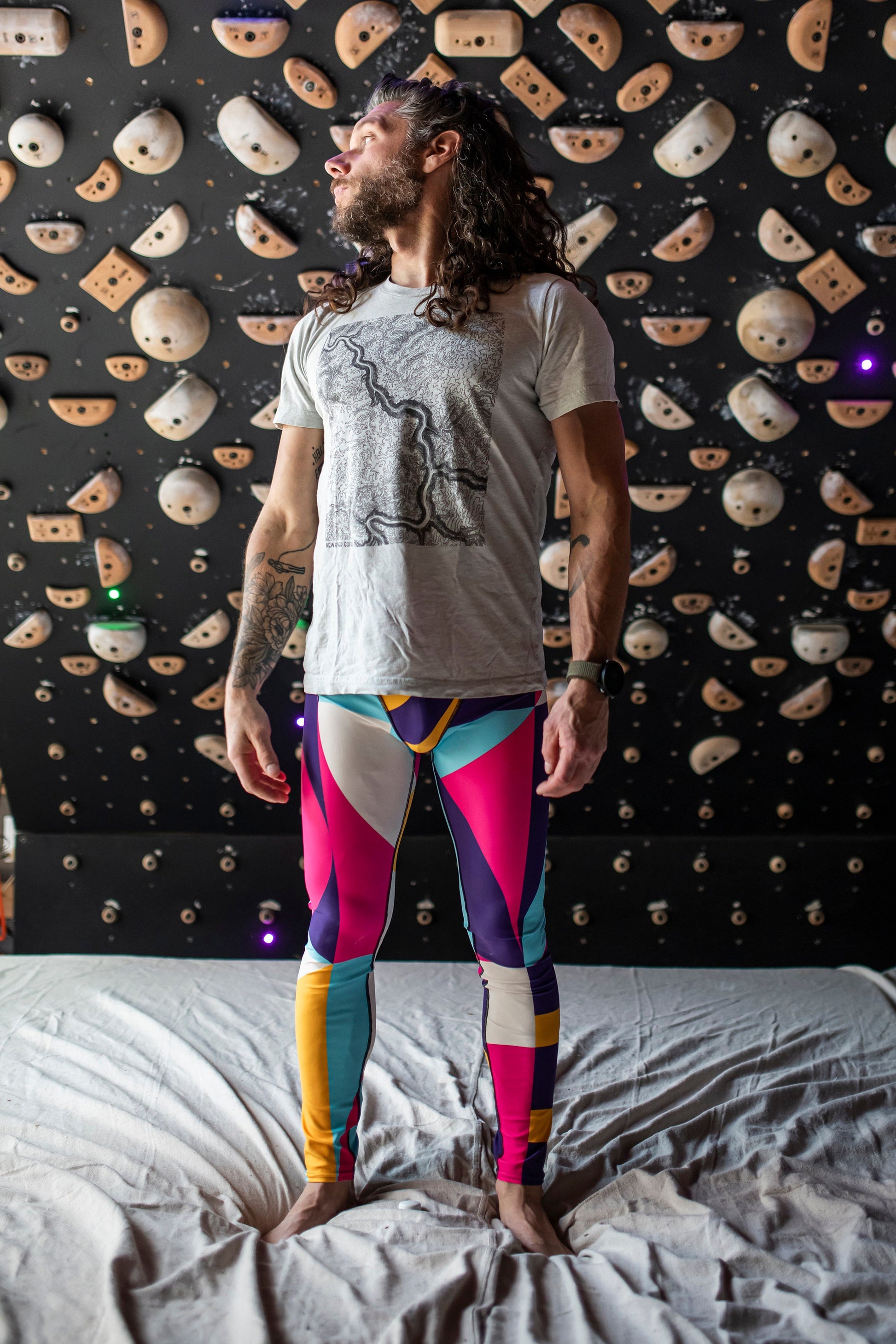Suitable for both men and women and great for climbing, yoga, running, and light layering, these leggings have a bright coral, purple, and sunburst colored geometric abstract pattern sure to stand out. Some of my favorite colors! Leggings are made of an 82% polyester 18% spandex blend and feature a stretchy elastic waistband. For our stateside customers, they're sewn by hand here in the USA!