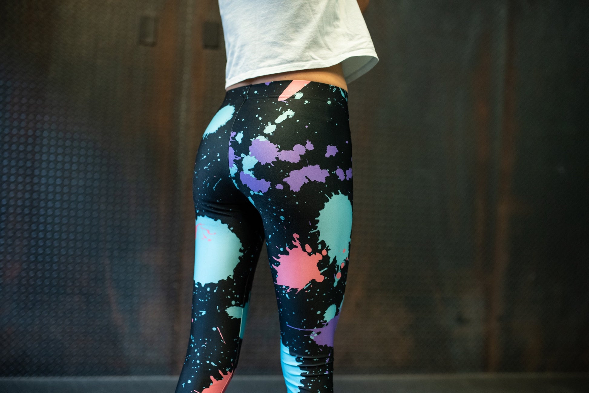 Wrap your legs in some wonderful contrasty color. These bright tights feature a black background with pink, purple, and teal splatters. They make a great compliment to our white-background paint splatter!