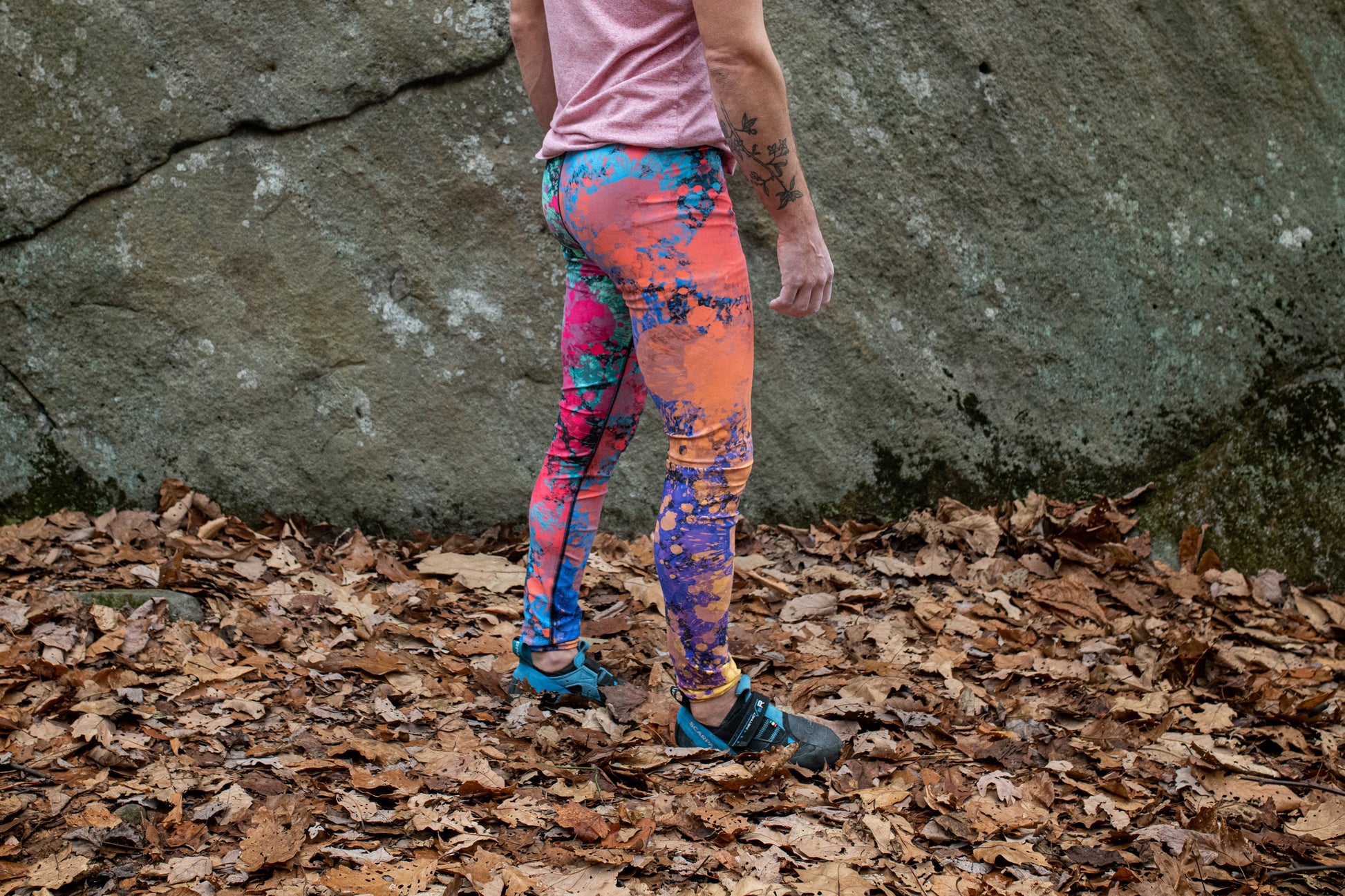Wrap your legs in some wonderful retro splatters. These bright tights feature a black background with rainbow splatters. Leggings are made of an 82% polyester 18% spandex blend and feature a stretchy elastic waistband. They're sewn by hand here in the USA!